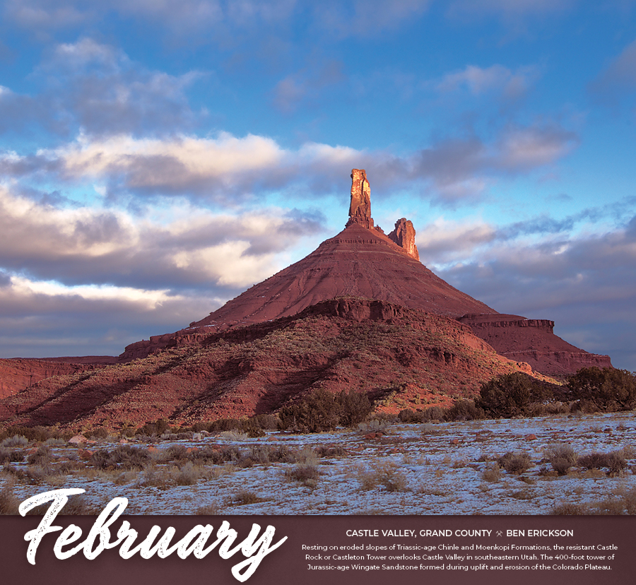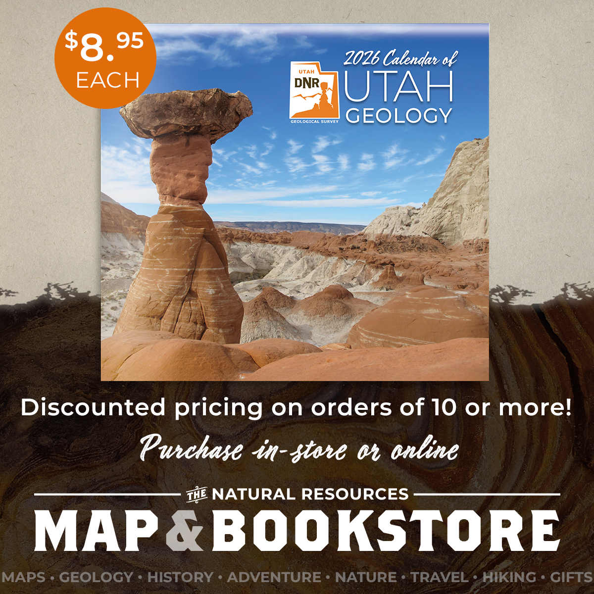 The 2026 Calendar of Utah Geology is available now at the Natural Resources Map & Bookstore! This beautiful wall calendar features a collection of stunning images captured by Utah Geological Survey staff who are often on assignment in some of the state’s most unique and picturesque locales. With interesting geologic information, the calendar is the perfect gift for all who appreciate and want to know more about Utah’s world-renowned natural landscapes.