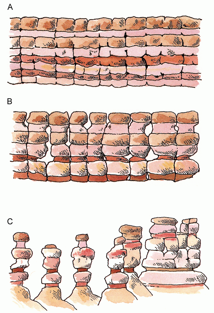Photo caption: Geology and weather conspired to carve Devils Kitchen. A grid of vertical fractures (called “joints”) creates zones of weakness within the horizontal beds of conglomerate and sandstone (A). These joints form conduits for the infiltration of surface and ground water, which enhances weathering along the joints. Weathering is further enhanced by the area’s harsh winter climate, which produces freeze-thaw cycles that act to break apart the rock. The broken rock is then washed away by snow melt and rain. This process of weathering and erosion continues to widen the joints, eventually leaving remnant fins (B) and hoodoos (C). Weathering and erosion continue to excavate and carve new sculptures and will eventually destroy the old ones. Illustration from Shadows of Time—the Geology of Bryce Canyon National Park by Frank DeCourten, 1994.